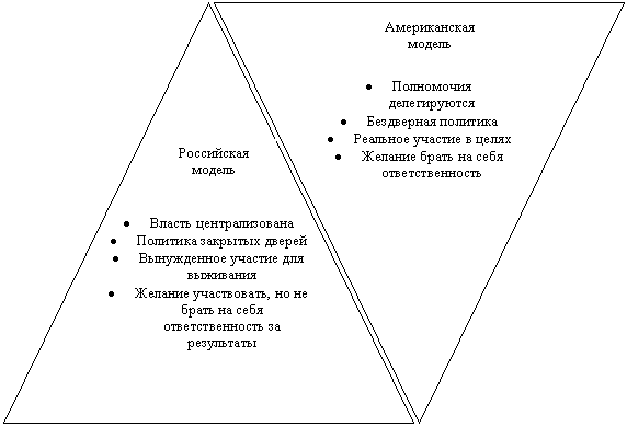 В России существует 2 основные проблемы: проблема власти (поскольку руководитель в системе без власти – не руководитель), проблема отношения к работе. В большинстве российских деловых организаций власть построена во-первых, сверху вниз, во-вторых, кластерами (замкнутыми группами). Кластерная форма характерна для западных бизнес-структур, но там такая группа – сплоченная команда. В отличие от Запада в России работа в группе плохо структурирована, плохо расписаны обязанности и функции каждого работника. На Западе работа в группе структурирована, задания и оценки каждого работника формализованы. Принято выделять 4 основных вида мотиваций, которые соответствуют той или иной группе стран или культур: По результатам исследований “новые русские” по своей мотивации примыкают ко второй группе, которая больше всего ценит стабильность, но в основном россияне предпочитают мотивацию на достижение и отказались от мысли ничего не менять. НАЗАДII.Роль Российской культуры в системе современного менеджмента Определенную систематизацию в изучение и описание российской культуры внесли работы Бердяева, Гумилева, Ключевского, Чаадаева и др. Ключевский приводит следующий перечень черт национального характера русского человека: расчетливость, изворотливость в мелких затруднениях, привычка в терпеливой борьбе с невзгодами и лишениями; больше оглядываться назад, чем заглядывать вперед; больше осмотрительности, чем предусмотрительности; кратковременное напряжение сил (аврал); каприз собственной отваги (авось). Делеганский указывает на такие социальные установки современного русского архетипа, как способность к терпению, духовность, приоритет духовного над материальным, широта русской натуры, способность впитывать инородные культурные образования, предрасположенность к социальной утопии к ожиданию чудесного и внезапного преображения жизни. Эти стороны характера необходимо учитывать в деятельности руководителей, как система государственного управления, так и менеджмента организации. Кроме того следует различать культуру россиян, включающую свыше 100 национальных культур. Для культуры русского человека характерно: почитание власти, желание участвовать в управлении, но не брать на себя ответственность. При выборе формы участия людей в управлении рекомендуется учитывать результаты исследований МГУ, в ходе которых были получены две модели участия в управлении. Модели участия в управлении В России участие в управлении является долговременной традицией: власть обращается к людям в тех случаях, когда чувствует свою слабость. Брать на себя ответственность люди не привыкли, поскольку это не стало элементом организационной культуры. Успехи и неудачи связывались подчиненными с работой руководителей. Россия является евроазиатской страной, поэтому российским менеджерам необходимо знать суть западной и восточной культур.